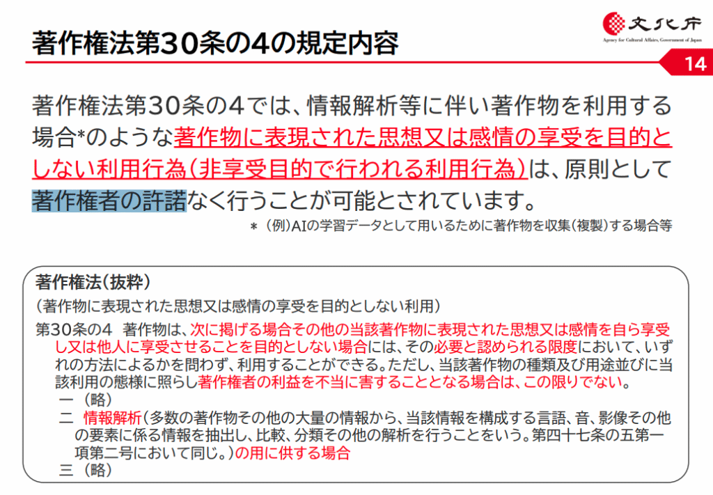 日本の著作権法では、著作権法30条の4において、情報解析を目的とする著作物の利用について、原則として著作権者の許諾なく利用できる旨が定められています。